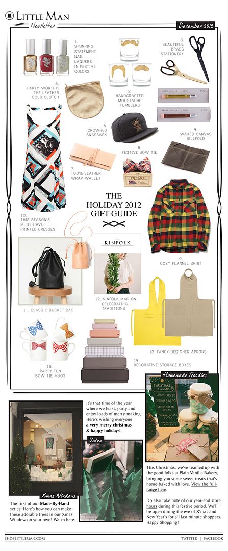 Anyway, I decided to start compiling Christmas gift ideas since the special day is less than 2 weeks away! For starters, the nice people at Little Man have curated a shopping guide for Christmas. I thought the designer aprons (number 13) were a great gift for cooks like moms and sisters! Another favourite would be the leather bucket bag from Baggu (number 11).