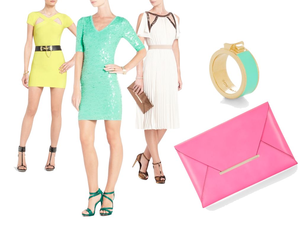 Bela cocktail dress, Maura V neck sequinned dress, Aveda pleated cocktail dress white, Enamel Turn-lock ring and Harlow leather envelop clutch