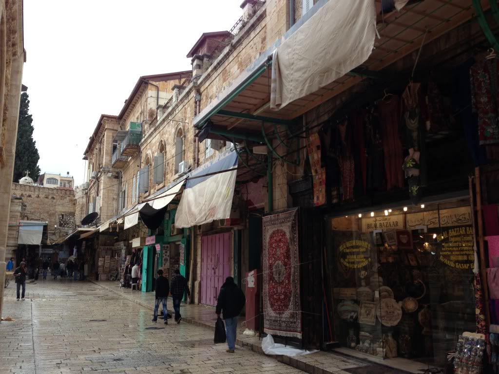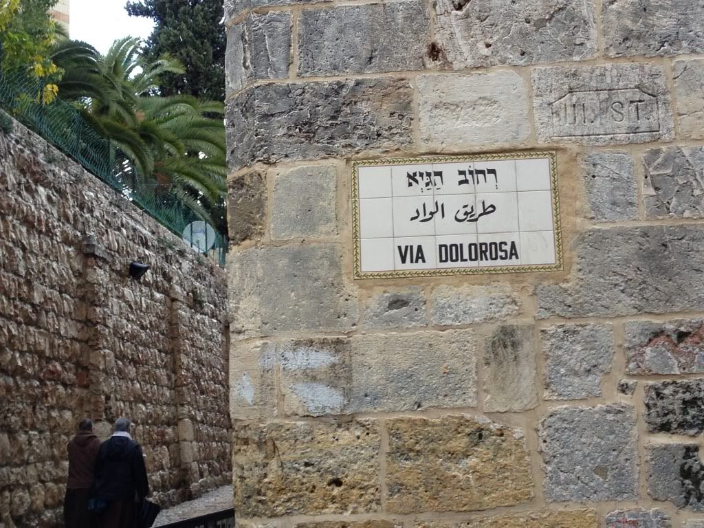 #Via Dolorosa is the route through the city where Jesus walked with his cross till he was crucified. It is not the actual route because the old streets of Jerusalem have been buried under many years of new streets. There were about 11 points along the journey and there supposedly used to be 50. One has the place where Jesus placed his hand on the wall. Franciscans walk the route every Friday praying and singing songs.