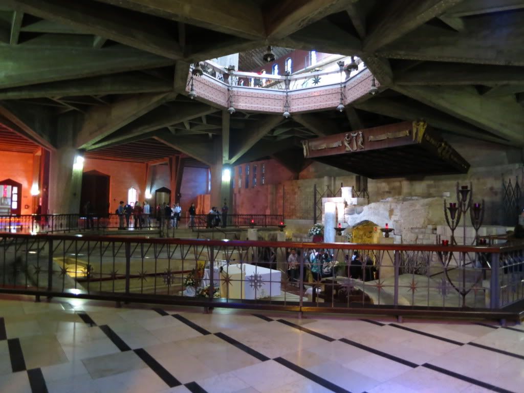 They built a beautiful church on Mary's and Joseph's houses (not their shared home). It's a pretty modern church that reminds me of La Sagrada Familia in Barcelona, Spain with its cement pillars and spacious structure.