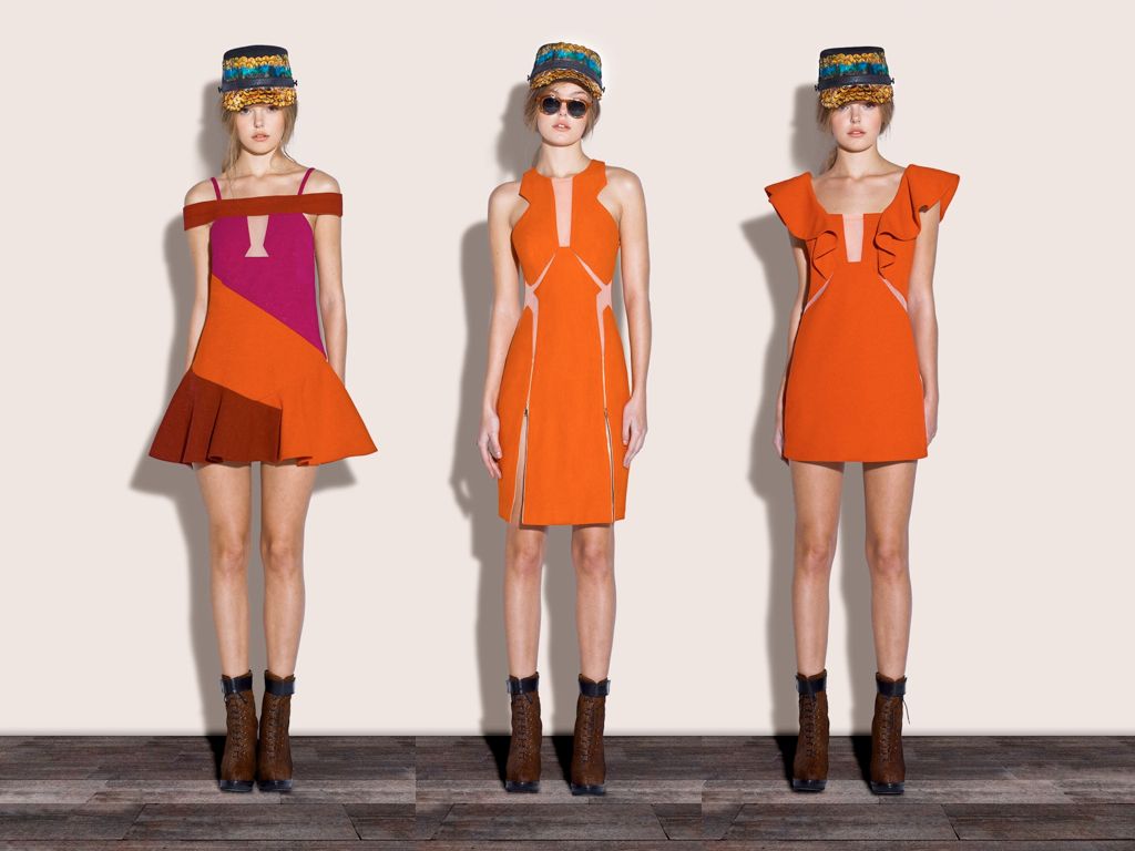 Another segment saw more warm tones with the strong use of orange. They applied the cut-out detailing in a different way like the way Alexander Wang used it. In addition, the dress with diagonal coloured stripes resembled an ensemble from Ostwald Helgason's Spring Summer 2013 collection which Miroslava Duma wore.