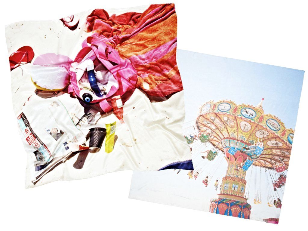 I like how these silk-satin scarves combine fashion apparel with photography. The photographs are like snaps of daily life, sometimes done in a dreamy style. They are pieces of art to wear around your neck and pictures for you to carry around.